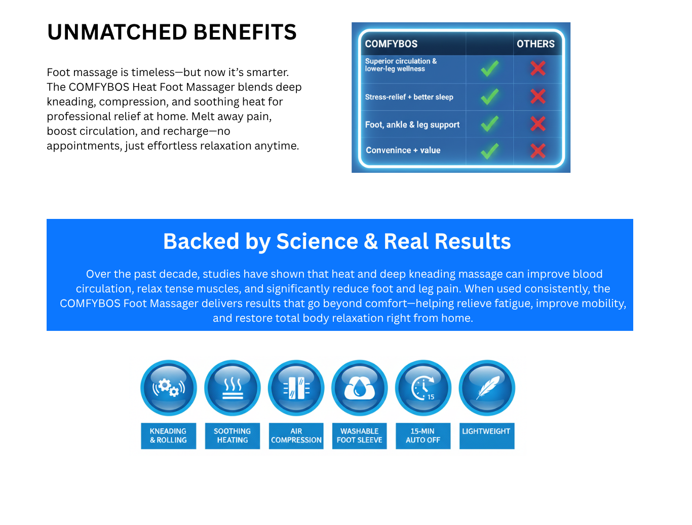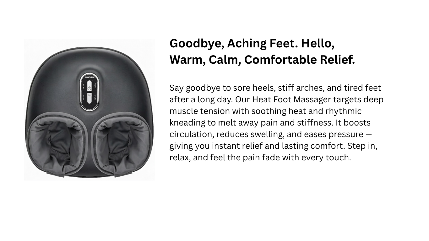 Your home, our passion. COMFYBOS is dedicated to creating products that support your health, relaxation, and balance right where you need it most — at home. Our Heat Foot Massager helps relieve tension, boost circulation, and melt away stress, turning every day into a moment of calm and care. Because at COMFYBOS, we believe a healthy, relaxed body starts from the feet up.